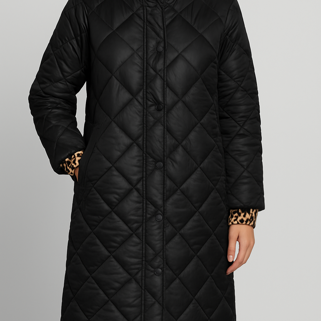 Cristiana – Srednje dolga obleka z oblogo, ki se lahko obrne, s leopardjim podlogo