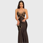 Postanite središče pozornosti s to očarljivo obleko za zabave iz satena, zasnovano za združitev elegance in zapeljevanja. Tanke naramnice in čipkast korzet dodajajo pridih romantike, medtem ko izrezi v pasu oblikujejo silhueto z rafinirano drznostjo. Silhueta sirene, ki se spušča do tal, spremlja vsak korak z gracioznostjo in tekočim gibanjem. Obleka, ki vsako priložnost spremeni v nepozaben trenutek.