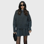 Odkrijte ta pleteninski set, ki združuje eleganco in udobje. Narejen iz mehkega in toplega materiala, s prijetnim prileganjem in brezčasno silhueto, je ta set pravi osnovni kos za hladnejše dni. Hoodie s krožnim ovratnikom in usklajene hlače ustvarjajo prefinjen in sproščen videz — popoln tako za sprostitev doma kot za dan v mestu.