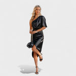Ta midi obleka iz satena je popolna ravnotežja med sofisticiranostjo in drznostjo. Z enim ramenom in strateško postavljenim nabiranjem subtilno, a vplivno poudari silhueto. Satenasti sijaj tkanine ji daje pridih luksuza, idealnega za posebne priložnosti — od elegantnih večerij do nočnih dogodkov. Kosi, ki vsako vstopanje spremeni v izjavo stila.