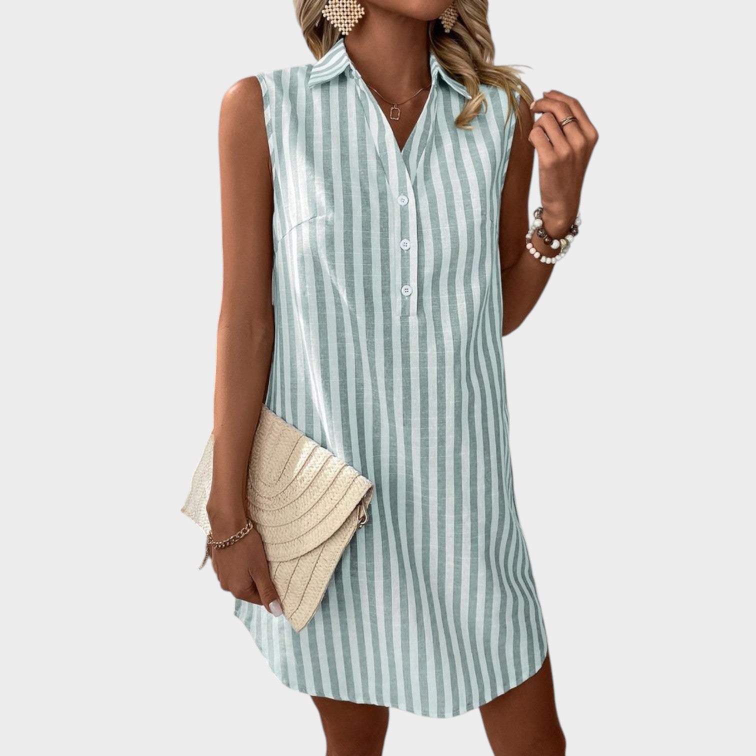S klasičnim dizajnom in sproščenim pridihom je ta prugasta brezrokavna obleka popolna definicija svežine in vsakodnevne elegance. Ravnokoten kroj, v kombinaciji z lahkim materialom, zagotavlja popolno udobje za bolj mile dni, medtem ko ovratnik s gumbi dodaja rafiniran pridih videzu. Idealna za sprehode na prostem, brunch-e in trenutke sprostitve, ki zahtevajo brezskrbno stilizacijo.