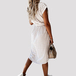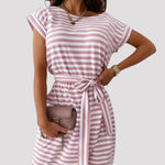 Ta elegantna črtasta obleka prinaša popolno ravnotežje med modernostjo in udobjem. Njena tekoča zasnova in poudarjena pas s trakcem zagotavljata mehko in ženstveno silhueto, idealno za vsako priložnost. Naj bo to delovni dan ali priložnostni dogodek, obleka je vsestranska in sofisticirana izbira. Z lahkim in zračnim materialom se boste počutili samozavestno in udobno čez ves dan.