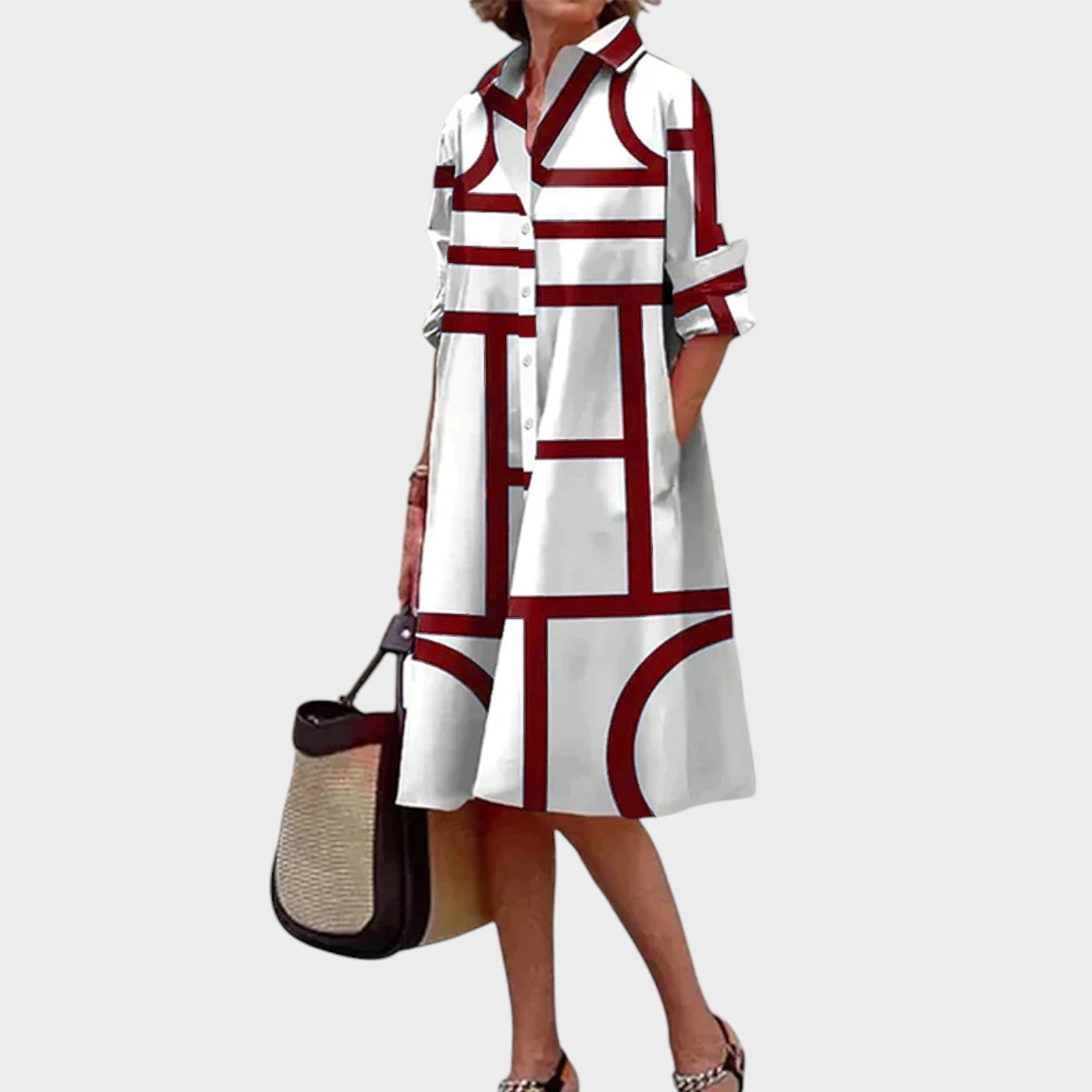 Privoščite si udobje in eleganco z našo obleko. Popolna za vsako priložnost, ta obleka poudari vaš stil s svojim edinstvenim geometrijskim vzorcem.