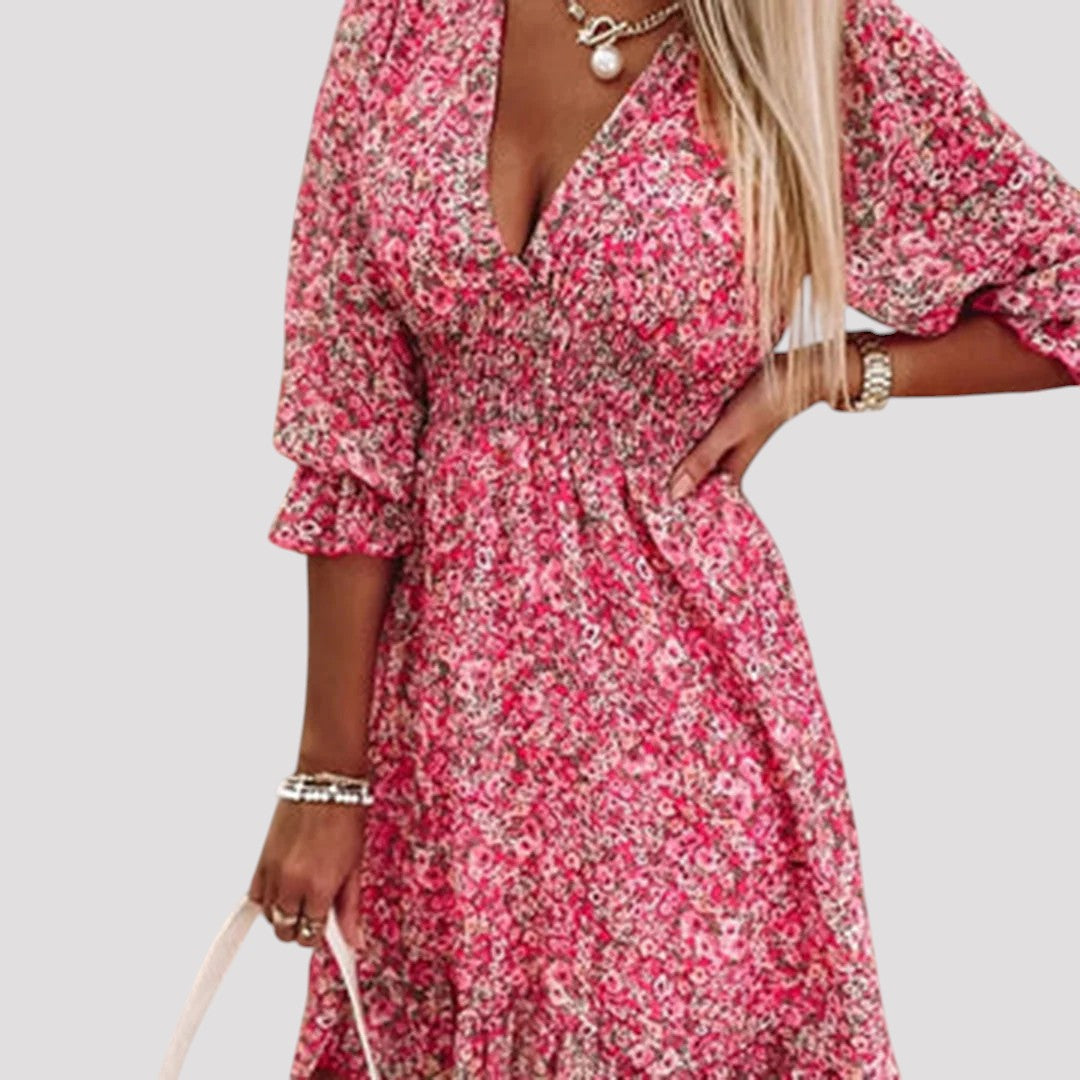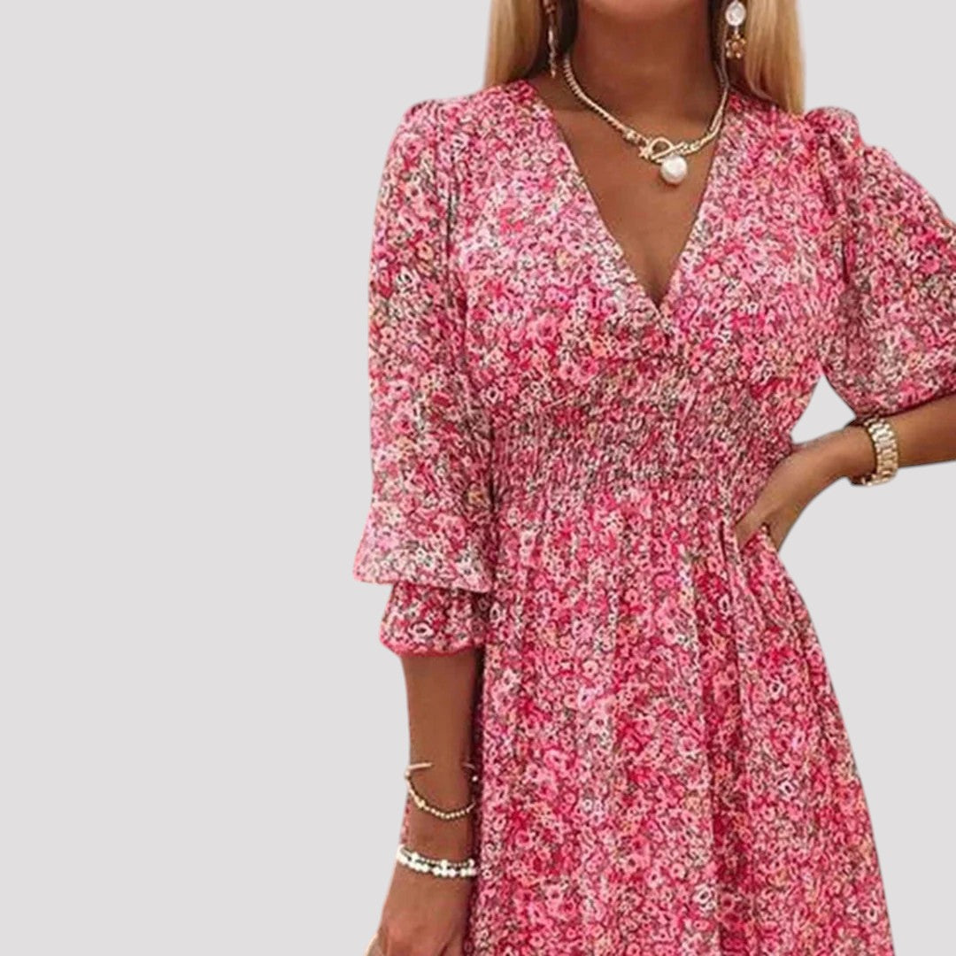To cvetlično obleko je popolna izbira za tiste, ki iščejo nežen in udoben videz. Ženski dizajn in tekoč kroj zagotavljata eleganten fit, ki nežno poudari silhueto. Idealna za toplejše dni, ponuja praktičnost in svežino, kar je kos, ki ga ne smete imeti v svoji omari za pomlad in poletje.
