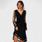 Očarajte ob kateri koli priložnosti s to sofisticirano črno obleko, ki popolnoma združuje klasiko in kanček drznosti. Z V-izrezom in dolgimi prosojnimi rokavi s svetlečimi detajli, ta kos subtilno in rafinirano prenaša čar in ženskost.